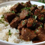A comforting skillet of savory beef tips served over steaming white rice, ready in just 30 minutes.