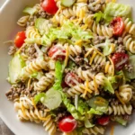 Imagine a salad that greets you with the warm, savory scent of browned beef mingling with the sweet tang of ketchup-laced dressing, the crisp bite of shredded lettuce, and the tender, toothsome swirl of rotini. Burger Pasta Salad is exactly that — a playful mash-up of cheeseburger nostalgia and summer pasta-salad ease. Each forkful offers a contrast of textures: juicy, seasoned beef; soft, springy pasta; crunchy pickles and onion; creamy dressing with a hint of mustard. It’s comfort food with a refreshing edge.