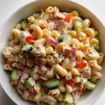 A refreshing and creamy tuna pasta salad, combining tuna, pasta, and fresh vegetables for a delightful summer dish.